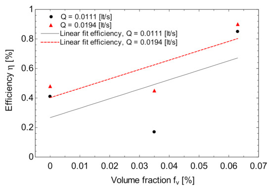 Figure 3 shows the efficiency of LTSC with respect to solar irradiation at different volume fractions using a nanoparticle diameter of 5 nm and a mass flow rate of 9 × 10−5 kg/s. From the figure, it can be seen that as solar irradiation increases, the efficiency decreases linearly. Likewise, it can be seen that as the volume fraction increases, the efficiency of the LTSC increases.