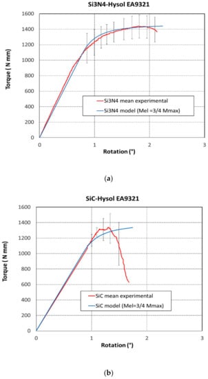 It is worth noting that the cohesive failure of the surface structured Si3N4 showed an evident plastic behaviour in the experimental torsion curve, while interfacial failures of SiC and steel joined samples exhibited a limited plastic region in the experimental curves.