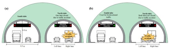 Cross-section of the twin-tube motorway tunnel examined when: (a) only one lane of the north tube is closed due to a traffic accident, (b) both lanes of the north tube are closed due to a traffic accident.