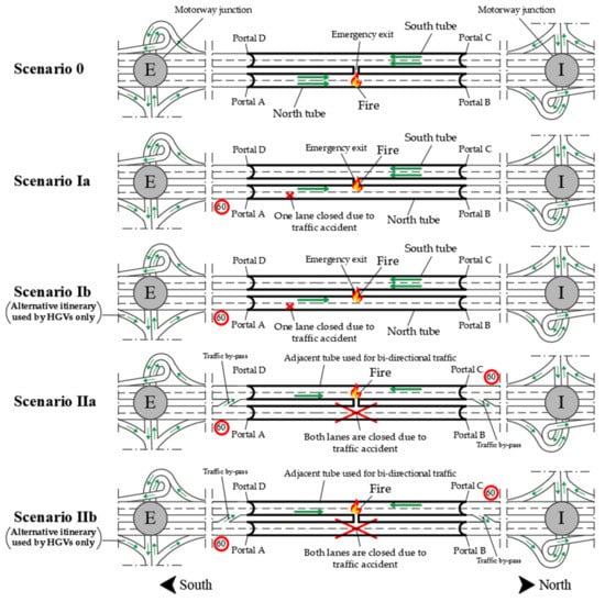 Figure 2 shows the scenarios investigated: (i) Scenario 0 represents the case in which the tunnel system is used under its ordinary conditions of functionality (i.e., without any traffic accident and with both lanes of each tube used for one driving direction) when a fire occurs in the north tube; (ii) Scenario Ia corresponds to the case in which, assuming that the north tube is partially closed due to a traffic accident on the right lane, a fire occurs on the undisrupted remaining lane of the north tube (i.e., the left lane); (iii) Scenario Ib is similar to Scenario Ia, but also includes the use of an alternative route along which, by using variable message signs (VMSs), only HGVs traveling towards the north are diverted; (iv) Scenario IIa corresponds to the case of the complete closure of the north tube and the use of the parallel tube for two-way traffic; here, the fire is assumed to occur on the lane used by the traffic flow traveling towards the north; (v) Scenario IIb is similar to Scenario IIa, but it also includes the use of an alternative route along which, using VMSs, only HGVs traveling towards the north are redirected. With reference to Scenarios IIa and IIb, the two traffic by-passes located at the tunnel portals, which allow for a change of carriageway, are assumed to be opened by the emergency service team in a very short time (i.e., 10 min) from the start of the traffic accident. The nodes E and I represent the two motorway junctions which are before the portals of the twin-tube tunnel that was investigated. Specifically, node E is used by HGVs when the alternative itinerary is recommended for these vehicles only.