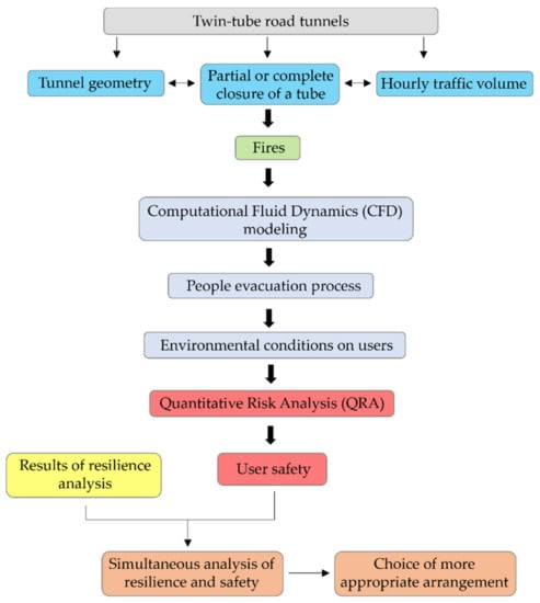 This study is set in the context of research on the simultaneous analysis of user safety and resilience of road tunnels, but expands the state-of-the-art by setting up a computational fluid dynamics (CFD) model to assess the risk exposure of users during their escape from the tunnel in the event of a fire occurring after a traffic accident had occurred, as well as estimating the corresponding potential number of victims with a probabilistic-based quantitative risk analysis (QRA). Therefore, given the lack of studies in which resilience is associated with user safety in road tunnels, this paper can serve as a possible reference for tunnel management agencies (TMAs), and a means of improving our knowledge in the field of the interaction between the recovery of the functionality of tunnels and user safety.