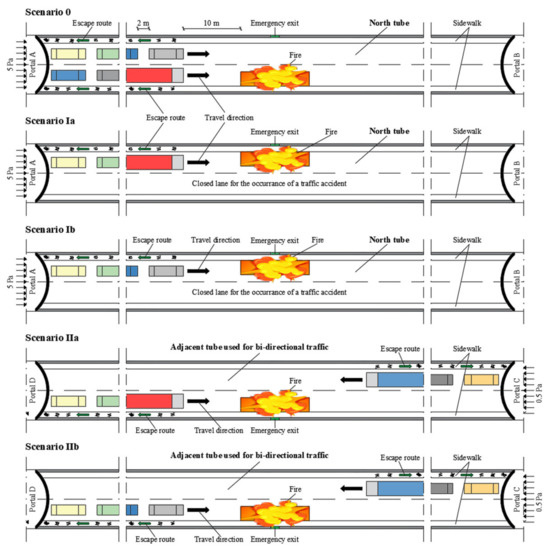 Schematic illustration of the scenarios investigated. Scenario 0: ordinary conditions of functionality of the tunnel system (i.e., both lanes of each tube are used for one driving direction) with a fire that occurs in the north tube; Scenario Ia: partial closure of the north tube (i.e., only the right lane is closed due to a traffic accident) with a fire that might occur on the left lane of the north tube; Scenario Ib: similar to Scenario Ia, but with the HGVs traveling towards the north tube diverted to an alternative itinerary; Scenario IIa: complete closure of the north tube (i.e., both lanes are closed due to a traffic accident) with a fire that might occur on the lane of the adjacent tube that is used by traffic traveling towards the north; Scenario IIb: similar to Scenario IIa, but with the HGVs traveling towards the north tube diverted to an alternative itinerary.