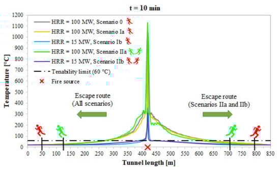 Longitudinal temperature profiles predicted at 2 m height along the escape path after 10 min from the start of the 100 MW (i.e., Scenarios 0, Ia, and IIa) or 15 MW (i.e., Scenarios Ib and IIb) fire located in the middle of the tunnel length. Scenario 0: ordinary conditions of functionality of the tunnel system (i.e., both lanes of each tube are used for one driving direction) with a fire that occurs in the north tube; Scenario Ia: partial closure of the north tube (i.e., only the right lane is closed due to a traffic accident) with a fire that might occur on the left lane of the north tube; Scenario Ib: similar to Scenario Ia, but with the HGVs traveling towards the north tube diverted to an alternative itinerary; Scenario IIa: complete closure of the north tube (i.e., both lanes are closed due to a traffic accident) with a fire that might occur on the lane of the adjacent tube that is used by traffic traveling towards the north; Scenario IIb: similar to Scenario IIa, but with the HGVs traveling towards the north tube diverted to an alternative itinerary.
