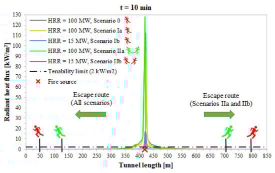 Figure 6 shows the longitudinal profiles radiant heat flux predicted at 2 m height along the escape path after 10 min from the start of the 100 MW (i.e., Scenarios 0, Ia, and IIa) or 15 MW (i.e., Scenarios Ib and IIb) fire located in the middle of the tunnel length.