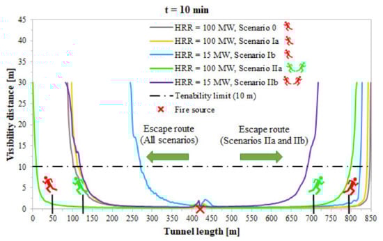 Figure 7 shows the longitudinal profiles of visibility distance predicted at 2 m height along the escape path after 10 min from the start of the 100 MW (i.e., Scenarios 0, Ia, and IIa) or 15 MW (i.e., Scenarios Ib and IIb) fire located in the middle of the tunnel length. Figure 7 shows how the last escaping user always has a visibility distance greater than the tenability limit of 10 m (i.e., dotted line) [], except for the 100 MW fire related to Scenario IIa in which he/she (the green user) might be exposed to unsafe environmental conditions due to his/her inability to discern evacuation signs located along the escape route.