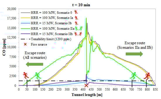 Figure 8 shows the longitudinal CO concentration profiles predicted at 2 m height along the escape path after 10 min from the start of the 100 MW (i.e., Scenarios 0, Ia, and IIa) or 15 MW (i.e., Scenarios Ib and IIb) fire located in the middle of the tunnel length. Based on these profiles, the last escaping user is exposed to a CO concentration lower than the tenability limit of 1200 ppm (i.e., dotted line) [] in Scenarios 0, Ia, Ib, and IIb, while he/she (the green user) might be exposed to unsafe environmental conditions in Scenario IIa.