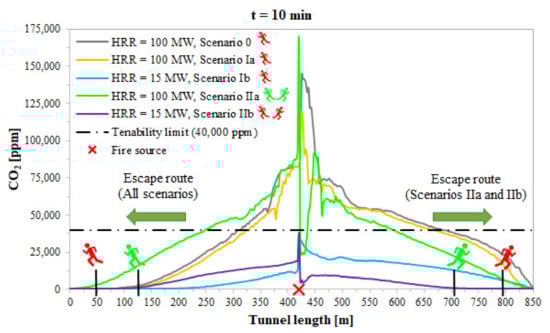 Figure 9 shows the longitudinal profiles of CO2 concentration predicted at 2 m height along the escape path after 10 min from the start of the 100 MW (i.e., Scenarios 0, Ia, and IIa) or 15 MW (i.e., Scenarios Ib and IIb) fire located in the middle of the tunnel length.