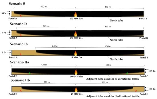In the case of the complete closure of the north tube and the use of the parallel tube for two-way traffic, the aforementioned five different types of burning vehicles were assumed to be located on the lane used by traffic traveling towards the north and at the aforementioned positions (i.e., 145, 280, 420, 570, and 710 m from portal D) in Scenario IIa; while in Scenario IIb, only light vehicles were considered (i.e., HRRmax of 8 and 15 MW) given that the HGVs were diverted to the alternative itinerary.