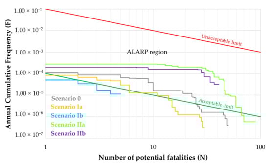 The number of users potentially at risk in a tube obviously depends on the number of cars, HGVs, and buses present in the queue. The occupancy rates of the cars and vans, HGVs, and buses were assumed to be equal to 1.7 [], 1, and 30 people, respectively. Given that the percentage of heavy vehicles was equal to 25% of the traffic flow (i.e., 23% of HGVs and 2% of buses), we estimated an average occupancy rate considering all the vehicles in the queue (i.e., cars, vans, buses, and HGVs) equal to 2 for Scenarios 0, Ia, and IIa; while that related to light vehicles only (i.e., cars and vans) was calculated to be 1.7 for Scenarios IIa and IIb. Obviously, by multiplying the number of queuing vehicles by 2 or 1.7, we were able to estimate the corresponding number of users escaping from the fire for the mentioned scenarios.