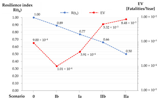 In order to describe the resilience through a parameter, whose value ranges between 0 and 1, we computed the resilience index ( ) that is widely used in the literature for transportation networks. A low resilience index denotes a high resilience loss (i.e., a resilience index equal to one corresponds to a zero-resilience loss). The resilience index confirmed the abovementioned findings of the resilience loss in all the scenarios investigated.
