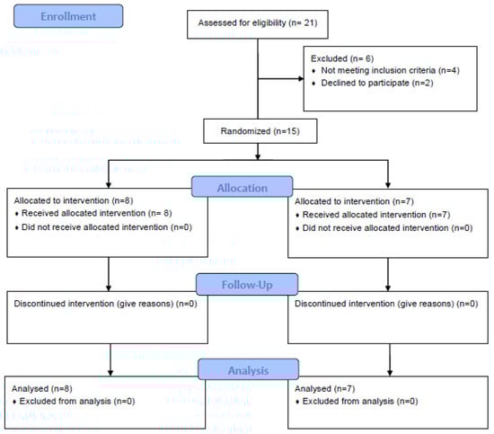 Out of 21 TMD patients assessed for eligibility, six were excluded (four did not meet inclusion criteria, two declined to participate). Fifteen patients were enrolled after providing informed consent and were randomized to rESWT therapy plus physical therapy (n = 8) or physical therapy alone (n = 7), as depicted in Figure 2.