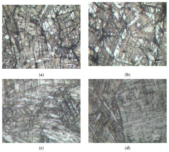 Figure 6 shows the color metallography diagrams of the alloy after different heat treatments. The alloy contains γ austenite and ε martensite (strip). It could be seen from Figure 6a,b that there are a large number of thin strip martensites in the alloy after forging. With the increase in annealing temperature, the thin strip ε martensite in the alloy gradually decreased.