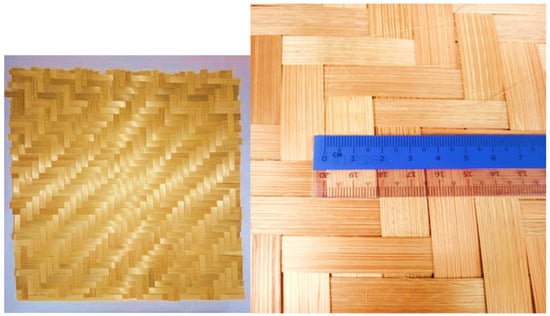 Matured semantan bamboo (Gigantochloa scortechinii) was used in this study since it exists abundantly in Malaysia and is among the most popularly used bamboo species by the local manufacturers. Semantan bamboo culm, with a diameter ranging from 45 to 60 mm, was supplied from a mill in the northern part of Peninsular Malaysia (Kedah, Malaysia). The bamboo plant height was around 3 m tall and only the first 2 m above the ground of the bamboo stem were used. The bamboo culms were then split into lumber strips using a cleaver and a handsaw to a dimension of 1000 mm (L) × 20 mm (W) × 5–10 mm (T). The bamboo strips were then treated with 5% borax and boric acid before being air-dried. After being dried, bamboo green (a thin pliable layer) was removed from the strips manually using a knife. The removed bamboo green was then weaved manually into a herringbone pattern as shown in Figure 1. The width of each strip was around 18 mm. The woven mat’s final size was around 500 mm wide × 500 mm long.