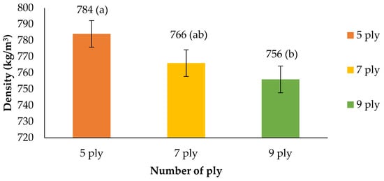 Density values of the laminated woven bamboo mat boards are shown in Figure 2. The boards’ density ranged from 784, 766 and 756 kg/m3 for 5-, 7-, and 9-ply panels, respectively. The results showed no significant difference between 5-ply and 7-ply, as well as between 7-ply and 9-ply. However, 5-ply laminated boards have significantly higher density than 9-ply laminated boards. The reason for the density value shown in Figure 2, is probably related to the number of ply. As the number of ply increases, the porosity increases, leading to air bubbles and spaces, which are contributed by each ply and increases as the ply increase, thus decreasing the density []. The formation of the 5-ply is more compact than 7- and 9-ply, due to the relation of the number of ply and porosity. Density has a linear correlation to porosity; the higher the density, the lower the porosity, resulting in a denser composite.