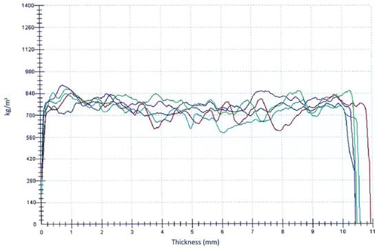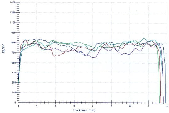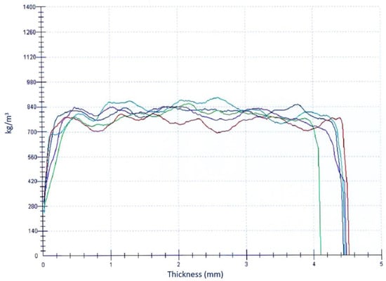 Density profile of 5-ply laminated woven bamboo mat boards (n = 5).