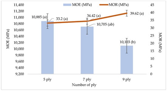 The static bending of the laminated woven bamboo mat boards is shown in Figure 6. Five-ply laminated boards have the highest MOE value of 10,885 MPa, while 7-ply has 10,705 MP and the lowest MOE value of 10,103 MPa was observed in 9-ply boards. Nine-ply boards have significantly lower MOE compared to that of 5-ply boards. As for MOR, the trend is in reverse order, where the highest MOR values were found in 9-ply boards (39.62 MPa), followed by 7-ply (34.42 MPa) and 5-ply (33.20 MPa). However, no significant difference between these boards in terms of MOR was observed.