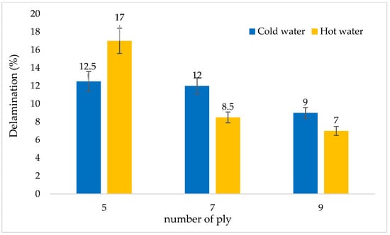 The delamination test was conducted to assess the bonding quality of the laminated woven bamboo mat boards. The test was carried out through immersion of the samples in cold water and hot water. Figure 9 depicts the percentage delamination of laminated boards of different ply. In a cold water immersion test, the result showed that 9-ply has the lowest delamination, followed by 7- and 5-ply. Similarly, 9-ply showed the lowest in delamination when immersed in hot water with an average delamination value of 7%, with 5-ply having the highest delamination (17%). The result indicated that 9-ply fares better in hot and cold water tests. The ANOVA test conducted showed that the effects of ply number is insignificant.