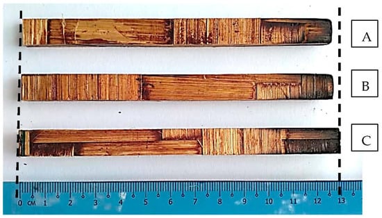 The (A) 5-ply, (B) 7-ply and (C) 9-ply of laminated woven bamboo mat boards after flammability test.