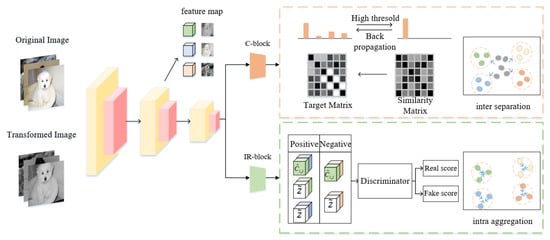 Model Overview. The original image and its transformed image are regarded as a pair of inputs to learn class-level (C-block) and instance-level (IR-block) representations using a shared deep neural network. The similarity matrix is generated from the class-level feature similarity relationship of the transformed images, and the target matrix is generated using K-means in the original image class-level feature space to guide the similarity matrix. Cluster standard samples are selected according to the threshold to modify the network parameters. The discriminator network estimates the mutual information of local-global and local-local representations, respectively.