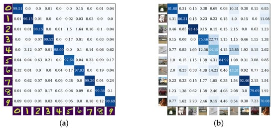 Confusion matrixes of the cluster results. (a,b) represent the clustering results on MNIST and Imagenet10 datasets, respectively.