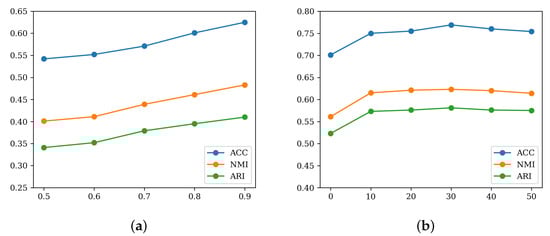 Impact of threshold. The clustering performance of STL-10 datasets under different thresholds in Equation (2) is displayed in Figure 4a. For STL-10, the clustering performance increases gradually as the threshold increases. It indicates that the correct rate of the selected cluster-standard samples is also gradually increasing.