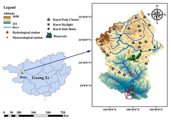 The Chengbi River originates from the eastern foot of Qinglong Mountain within Lingyun County, located to the northeast of Baise city, Guangxi district, China. The geographical location of the Chengbi River watershed is shown in Figure 1. The drainage area of the Chengbi River basin is 2087 km2, which is typical of a karst-area basin; karst geomorphic area occupies about 53.7% of the total area of the basin, while the total reservoir capacity is 1.15 billion m3, and the water surface area is 39.1 km2. The unique features of this watershed are the numerous karst sinkholes, karst skylights, and karst peak clusters in the northern region, while the southern region mainly contains a karst peak clusters and a reservoir []. The Chengbi River basin is a typical karst basin, where the karst features on the surface are obvious, but the subsurface is not well understood, and the presence of the reservoir makes the runoff process more difficult to predict. This phenomenon is common in other karst watersheds []. Therefore, there is an urgent need to combine standard artificial intelligence models, pre-processing techniques, and post-processing methods to generate more accurate runoff predictions.