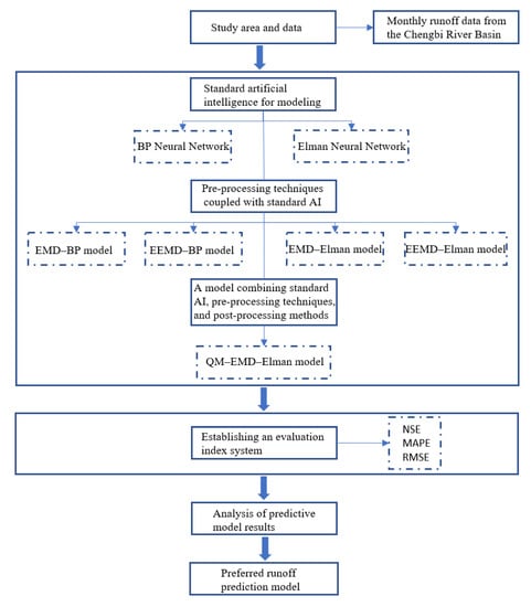 First, the standard artificial intelligence models, namely, the BP neural network model and the Elman neural network model, were used for monthly runoff prediction. The prediction ability of the two AI models was initially investigated, and subsequent modeling was performed based on them. Secondly, the EMD and EEMD pre-processing techniques were combined with the two artificial intelligence models to construct the EMD–BP, the EEMD–BP, the EMD–Elman, and the EEMD–Elman models. The accuracy of these four models was evaluated, and the model with the best prediction outcomes was selected for subsequent study. Finally, the quantile mapping method was used to post-process the best prediction model from the previous step to see whether the prediction accuracy could be further improved.