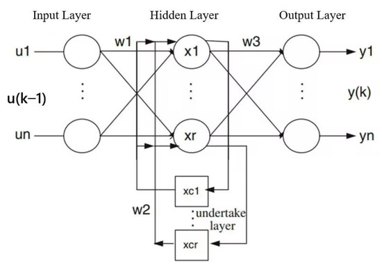 The Elman neural network model is a class of local regression networks with extreme computational power, connecting local memory units with local feedback. Compared to the general static neural network, Elman has an additional association layer, which is used as the input of the implicit layer and as the input of the implicit layer at the previous moment, and has the characteristics of fast approximation and good dynamic characteristics []. The specific structure is shown in Figure 4 []. The mathematical model of the Elman neural network is