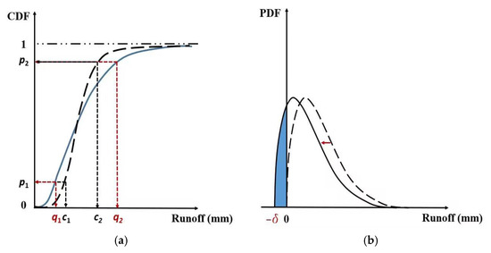 Quantile Mapping is a widely used bias-correction method. The statistical transformation process of the distribution-mapping method is to determine a statistical distribution in advance so that the distribution fitted by the observations is mapped to the distribution fitted by the predicted values by quantile with minimum error []. The method corrects the simulated runoff depth by establishing a transfer function between the simulated runoff depth and the observed runoff depth. The principle schematic of the quantum mapping method is shown in Figure 5, and the specific correction method is as follows: calculate the cumulative distribution function (CDF); construct the transfer function (TF); correct the model runoff depth for the validation period for each grid using the transfer function at the time of modeling; and obtain the correct results for the whole watershed [].