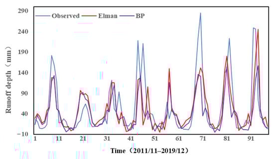 The combined analysis shows that neither the BP nor the Elman model reached a prediction accuracy of Grade C or higher. In terms of the NSE evaluation index, the NSE value of the BP model was 0.49, while that of the Elman was 0.43. In terms of the MAPE evaluation index, the MAPE value of the BP model was 83.35%, while that of Elman model was 108.36%. In terms of the RMSE evaluation index, the RMSE value of the BP model was 45.46 mm, while that of the Elman model was 50.00 mm. In terms of the PPTS evaluation index, the PPTS value of the BP model was 4.69, while that of Elman model was 4.37. Taken together, the results indicate that the predictions of the BP model were better than those of the Elman model, but that overall neither model was satisfactory.