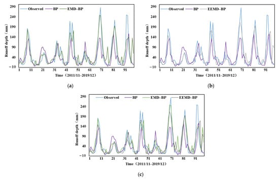 Forecasted and observed monthly streamflow during the validation period by the BP model, based on EMD and EEMD pre-processing techniques. (a) Prediction results of EMD–BP model. (b) Prediction results of EEMD–BP model. (c) Prediction results of EMD–BP model, and EEMD–BP model.