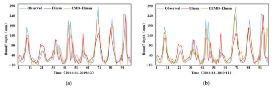 Ensemble empirical modal decomposition can better solve the modal confounding problem in the empirical modal decomposition method by taking advantage of the good zero-mean characteristic of white noise. Li et al. [] proposed the EMD–ANN and the EEMD–ANN models for long-term runoff prediction and evaluated the prediction accuracy of both; they found that, compared with the EMD–ANN model, the EEMD–ANN model performed better in predicting high flow values, and best matched the observed results. In the present study, the coupled models formed by EMD with Elman and BP were more accurate than the coupled models formed by EEMD with Elman and BP, which is inconsistent with some scholars’ studies [,]. This phenomenon may be due to the fact that the runoff series in the present study are based on karst areas, where the subterranean topographical conditions are extremely different from other areas, and which have a continuous effect on runoff [].