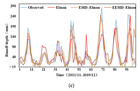 Forecasted and observed monthly streamflow during the validation period by Elman model, based on EMD and EEMD pre-processing techniques. (a) Prediction results of EMD–Elman model. (b) Prediction results of EEMD–Elman model. (c) Prediction results of EMD–Elman model, and EEMD–Elman model.