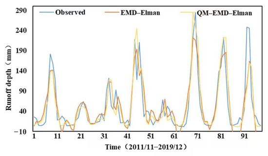 Among three of the evaluation indicators employed in the present study, better model simulation is indicated by higher values for the Nash–Sutcliffe efficiency, and lower values for the root mean square error and the mean absolute percentage error []. The prediction results of the QM–EMD–Elman model showed a significant improvement in the MAPE and RMSE indicators compared with the EMD–Elman model, with only a slight fluctuation in the NSE indicator. This indicates that the prediction accuracy of the triple-coupled model, formed by adding post-processing to the double-coupled model, was improved again, suggesting that the post-processing method can effectively control the prediction error. This result is consistent with the study conducted by Jin et al. [] In this study, Jin used the Xinanjiang model driven by seven control forecast products, such as ECMWF and UKMO, for integrated runoff prediction and then investigated the effects of data processing schemes on runoff prediction accuracy and uncertainty, using the post-processing method of the BMA model. The results showed that post-processing methods are essential to improve the accuracy and rationality of meteorological and hydrological runoff predictions. This phenomenon may be because the post-processing method removes the negative values from the prediction results and ensures that all data are positive, which controls the output error very well. Since the ensemble model can combine the advantages of several single models, the ensemble model performs better for runoff forecasting. Therefore, the QM–EMD–Elman model can significantly improve the precision of monthly runoff predictions, and its runoff series prediction results are meaningful.