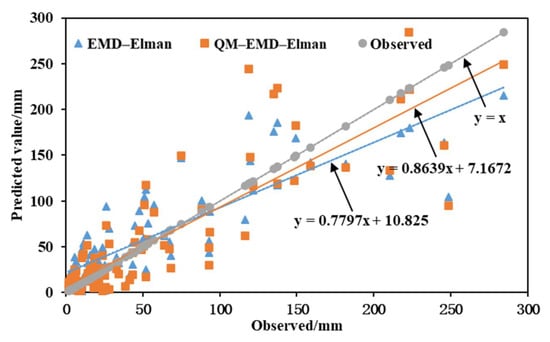 As can be seen from Figure 11, the plot is a scatter fit of the two models mentioned above. By comparing each model with the linear trend line of the line y = x, it is clear that the linear trend line of the QM–EMD–Elman model is closest to the line y = x, while the EMD–Elman model is the following closest. This shows that the QM–EMD–Elman model has better prediction accuracy than the other model.
