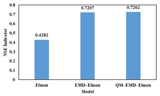 In Figure 12, the NSE indicator is analyzed separately because it is the indicator that best reflects a model’s strengths and weaknesses []. As can be seen in the figure, the NSE indicators of the Elman model, EMD–Elman model, and QM–EMD–Elman model show an increasing trend, and it can also be seen that the QM–EMD–Elman model has the best prediction results among the three models.