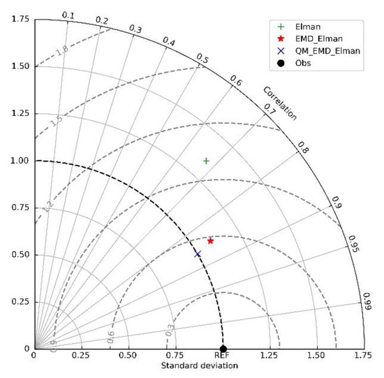 As can be seen from Figure 13, the prediction accuracy of the Elman model, the EMD–Elman model, and the QM–EMD–Elman model was further evaluated using Taylor plots. Taylor diagrams are based on the geometrical relationships between the correlation coefficient, standard deviation, and the root mean square error []. Taylor plots precisely and effectively reflect the properties of a prediction model, indicating when results are closer to the observed values, and are thus better prediction []. The graph shows that the predicted values of the QM–EMD–Elman model are closest to the observed values.