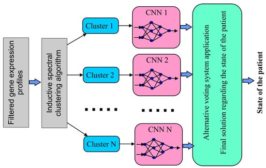 We believe that the objectivity of identifying the object state can be enhanced by parallelizing the process of processing gene expression data. This can be achieved by forming subsets of differentially expressed and mutually correlated gene expression profiles, followed by classifying objects containing gene expression data in the selected clusters. The final decision is reached by analyzing the classification results of all clusters using an alternative voting system. Figure 1 shows a structural block diagram for implementing this procedure.