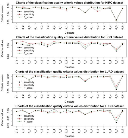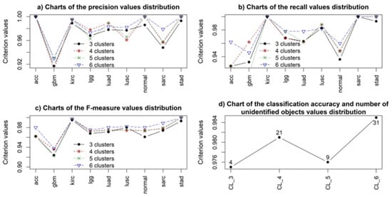 The analysis of the simulation results also indicated the higher effectiveness of using the four-cluster structure for identifying the type of cancer. Analysis of the classification quality criteria values for samples corresponding to different types of cancer and the health state of patients (Figure 8a–c) suggested higher values and a better stability of these criteria when using the four-cluster structure compared to using other cluster structures. However, it should be noted that, when using the four-cluster structure, the state of a relatively large number of objects (31 out of 1140) was identified as undefined, which is undoubtedly a drawback of the RF-based model. Another significant drawback was the large amount of time required to train the model. The current training of data for each model (when using each cluster structure), took about 80 h.