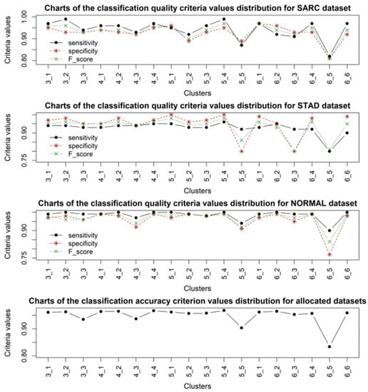 Analysis of the obtained results allowed us to identify a high convergence of the clustering quality criteria, the distribution of which for the obtained cluster structures is presented in Figure 2. It should be noted that, in almost all cases, the accuracy of sample classification was quite high, while in each cluster structure, one cluster of gene expression profiles could be distinguished, the application of which resulted in a lower classification accuracy compared to the other cases. According to the clustering criteria presented in Figure 2, the four- and six-cluster structures are optimal. According to the classification quality criteria, the four-cluster structure was the most stable for all types of sample studied. When using a six-cluster structure, five clusters provided a high classification accuracy according to the criteria used, while the fifth cluster yielded significantly lower results in sample classification. This fact indicates the adequacy of the distribution of gene expression profiles into clusters when forming the cluster structure. The results of sample classification using the four-cluster structure were the most stable for all types of data. However, it should be noted that the worst results for sample classification were obtained when using samples with ACC cancer. This can be explained by the smaller number of samples compared to the other types of data, which could undoubtedly have affected the model’s sensitivity. The best results were obtained when classifying samples for which cancer was not detected (NORMAL). The obtained results also indicated the feasibility of using an alternative voting system as the last step when making the final decision on the presence or absence of the corresponding disease, since decisions based on applying one set of gene expression data are not objective.