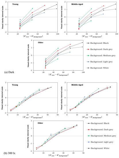 The influence of positive and negative contrast on the observers’ response to the visibility is discussed. The results are shown in Figure 5. Due to the high correlation and the similar trend of the experimental results between the different age groups, the data with the lowest correlation, in which the illuminance level is 9000 lx, is discussed for the older observers. According to Figure 5a, a higher positive contrast (i.e., the text is darker than the background) is better to improve the visual clarity for the white and light gray backgrounds under the dark surround condition. However, a negative contrast (i.e., the text is brighter than the background) is beneficial to the increase in visual clarity for the rest of the three backgrounds.