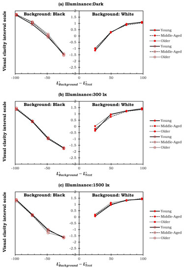 As a result of the correlation coefficient in Table 4, the visual clarity in the three age groups is very similar at each illuminance level. Significantly, all observers present better visual clarity with the increase in the difference in lightness between text and background, especially for the 9000 lx surround condition. The result also indicates that the observers perceive higher visual clarity when reading the content with high to low luminance contrast between text and background. Referring to Figure 4a, a text-background lightness combination—white text with black background (i.e., L*background = 1.88; L*text = 100)—is consistently judged the clearest for all ages when the surround is dark. Under the daylight surround (i.e., 300, 1500, and 9000 lx), the text-background combination of black text with a white background (L*background = 100; L*text = 96.19 for 9000 lx) is judged as the clearest for all ages except middle-aged under 1500 lx, as shown in Figure 4b–d. When the ambient lighting is 9000 lx, the observers generally feel clearer about the combinations with a white background than those with a black one under the same difference in lightness. In contrast, combinations with a black background can provide better visual clarity than those with a white one under dark surround conditions.