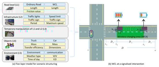 Using intelligent urban transportation systems as well as vehicle-to-vehicle and vehicle-to-infrastructure technologies, the CAEFVs located in the upstream area of signalised intersections can receive important state information in advance, including their positions, traffic signal phase status, and surrounding vehicle information. Moreover, the wireless charging scenario at signalised intersections (WCSSI) consists of multiple scenario elements including vehicles, static environments, and dynamic environments. To hierarchically analyse a combination of vehicles, roads, and environmental elements in a coupled scenario, an adapted hierarchical model was used for a scenario representation based on the study conducted by Menzel et al. []. In this model, scenarios are divided into basic components, and only the interactions between all five layers represent a complete scene. The five-layer model is used to construct the scene depicted in Figure 1a with the three lower layers describing its static parts. The fourth layer focuses on moving objects, while the fifth layer describes the environmental conditions and vehicle-to-everything communication.