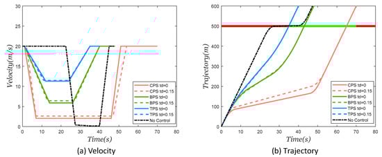 In Figure 2a, the minimum speed of the vehicle without a control strategy is 0 m/s, and the vehicle remains stationary at the stop line of the signalised intersection. For the CAEFVs controlled by the optimal driving control model, no STOP–GO behaviour is observed in the CPS, BPS, and TPS, and the vehicles pass through the signalised intersection without stopping in different modes. After introducing a communication delay, the speed curves of the three modes become different. The time required for the CAEFVs driving in the CPS mode to cross the entire signalised intersection is approximately 70 s, and the largest difference between their lowest speeds is 0.24 m/s. However, the times required for the CAEFVs driving in the BPS and TPS modes to cross the entire signalised intersection are equal to 48 and 40 s, and the corresponding minimum speed differences are 0.33 and 0.18 m/s, respectively. Figure 2b illustrates the vehicle passing process through a signalised intersection. In the scenario without a control strategy, the vehicle is affected by the red light and remains idle before the stop line at the signalised intersection. The CAEFVs that consider a communication delay can receive road and signal-light status information in advance, enabling effective decision-making optimisation control and avoiding the idling of vehicles at the signalised intersections.
