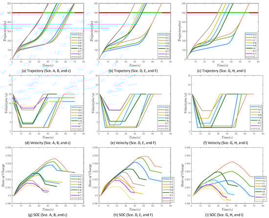To analyse the effects of the initial vehicle speed, WCL length, and charging efficiency on the model performance and differences between the three passing strategies, nine scenarios are considered in this study to determine the SOC. According to Table 5, scenarios A, B, and C are constructed for different initial speeds with a fixed WCA and charging efficiency. Scenarios D, E, and F and G, H, and I are constructed for different charging area lengths and charging efficiencies, respectively.