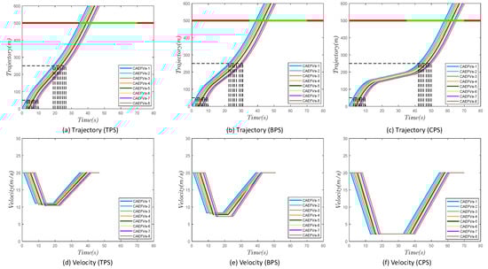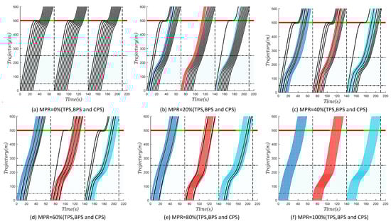 Figure 6 shows the spatiotemporal trajectories of 30 vehicles obtained at different MPRs (0–100%). The vehicle trajectories determined for the TPS, BPS, CPS, and IDM (control) are represented by the dark blue, red, light blue, and black lines, respectively. Overall, as the MPR value increases, the number of vehicles stopping and waiting at the intersection stop line gradually decreases, and more vehicles travel through the signalised intersection along the optimised or suboptimal trajectories. However, a low penetration rate increases the fluctuations of vehicle trajectories, and even the IDM-controlled vehicles may not be able to cross the CA within the required timeframe. As shown in Figure 6c,d, when the preceding vehicle is a CAEFV, it can effectively shape the trajectory of the following vehicle. However, when the preceding vehicle is an IDM-controlled vehicle, it cannot effectively guide the following vehicle driving in the CPS mode. Therefore, increasing the market share of CAEFVs may significantly improve the passing efficiency of vehicles in the CA.