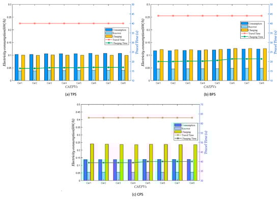 Figure 5 shows the power consumption values and travel times of the vehicles travelling in different modes. For the CPS, the vehicle consumes, recovers, and charges approximately 0.137, 0.054, and 0.241 kW/h, respectively, and its travel time and charging time are equal to approximately 63 and 39.5 s, respectively. These values are larger than those obtained for the BPS (0.02 kW/h, 0.008 kW/h, 0.199 kW/h, 19.1 s, and 18.8 s, respectively). The vehicle driving in the TPS mode crosses the signal crossing with less power consumption; however, in this case, it also receives the lowest amount of recovered energy and charging power. This means that CAEFVs driving in different modes can reasonably use the WCA and that the vehicles must consume more power at larger driving speed variations. The regenerative braking recovery energy does not significantly fluctuate with speed; however, it gradually increases with decreasing speed. Furthermore, the travel time in the TPS mode is shorter than that in the CPS mode by approximately 23 s, which is advantageous in terms of traffic efficiency.