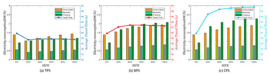Figure 7 shows the average travel times and power consumption values obtained in different modes at MPRs varying from 0 and 100%. According to Figure 7a, the power consumption, regenerative braking recovery energy, charging power, and average travel time determined for the mixed traffic with the TPS at an MPR of 0% are equal to 1.388 kW, 0.56 kW, 0.943 kW, and 39.7 s, respectively. When the MPR value is increased from 20% to 100%, the regenerative braking recovery energy decreases by approximately 4.6–37.2%, and the average travel time saving amounts to 2.1 s. This indicates that as the MPR increases, the TPS has an advantage in terms of the traffic efficiency. When the MPR reaches 100%, the rise in the power consumption as compared with the values obtained at other MPRs is approximately 3.3–37.1%. For the BPS and CPS modes described in Figure 5b,c, the power consumption increases with increasing MPR from 1.388 kW by approximately 11.7–39.4% and 6.8–37.3%, respectively. Meanwhile, the charging power increases from 0.943 kW to 2.073 and 2.276 kW, respectively, while the regenerative braking recovery energy also exhibits a slow upward trend, which indicates that the vehicle has a significant charging advantage when driving through signalised intersections in the CPS mode. For the BPS, the average vehicle travel time increases slightly. In contrast, the average travel time in the CPS mode increases significantly, which also indicates that the vehicle inevitably sacrifices travel time to gain more power while driving. Thus, each mode succeeds in achieving its own objectives.