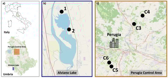 Map of the study area. (a) Localization of the two sampling areas in the Umbria Region, Central Italy, with the blue rectangle indicating Alviano Lake and the orange rectangle indicating the Perugia control area; (b) Alviano Lake, sites 1, 2; and (c) Perugia control area, sites C3, C4, C5, C6.