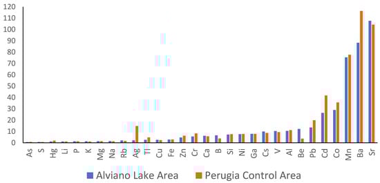 In addition, the G/B−G ratios of the toxic elements for the biota showed lower values in the Alviano Lake samples, in comparison to those from the control area: As (0.60 vs. 0.75), Hg (1.10 vs. 1.91), Pb (13.47 vs. 19.91), and Cd (26.33 vs. 41.76) (Figure 2).